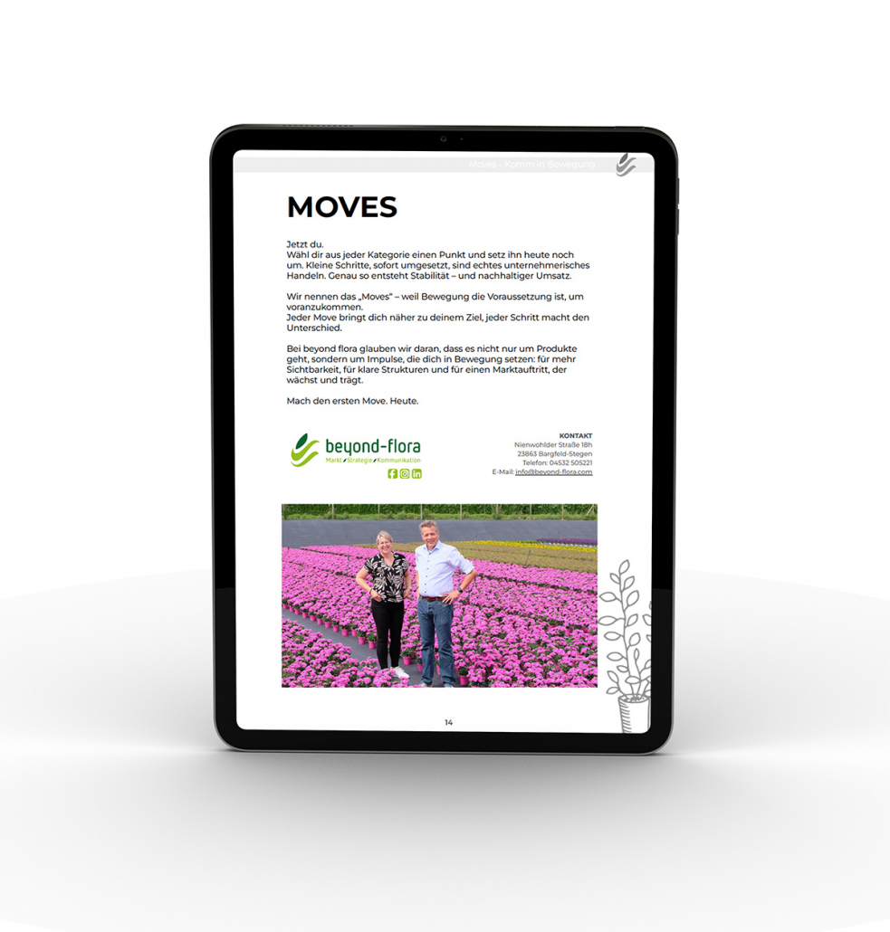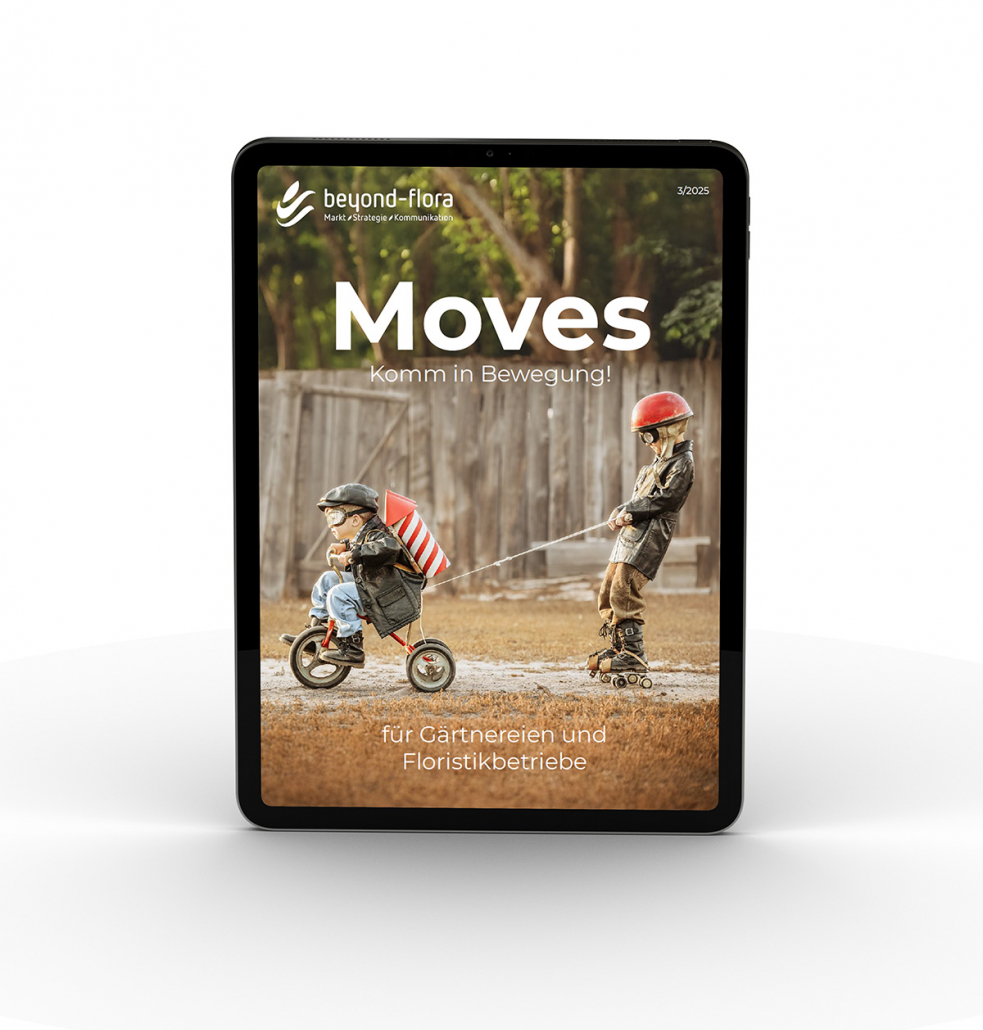 Gleich 60 praxisnahe Moves, gebündelt in 5 Themenfeldern speziell für Floristik, Großhandel, Produktionsgartenbau, GaLaBau und alle, die in der grünen Branche was bewegen wollen.